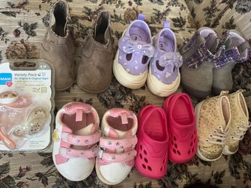 The baby shoes range from in size 3-6 months, size 2, and size 3. Pacifier is new. Selling as a whole. Asking $25 for everything. Call Kevin at (715) 225-7798 for more details. Can provide more information and pictures upon asking.